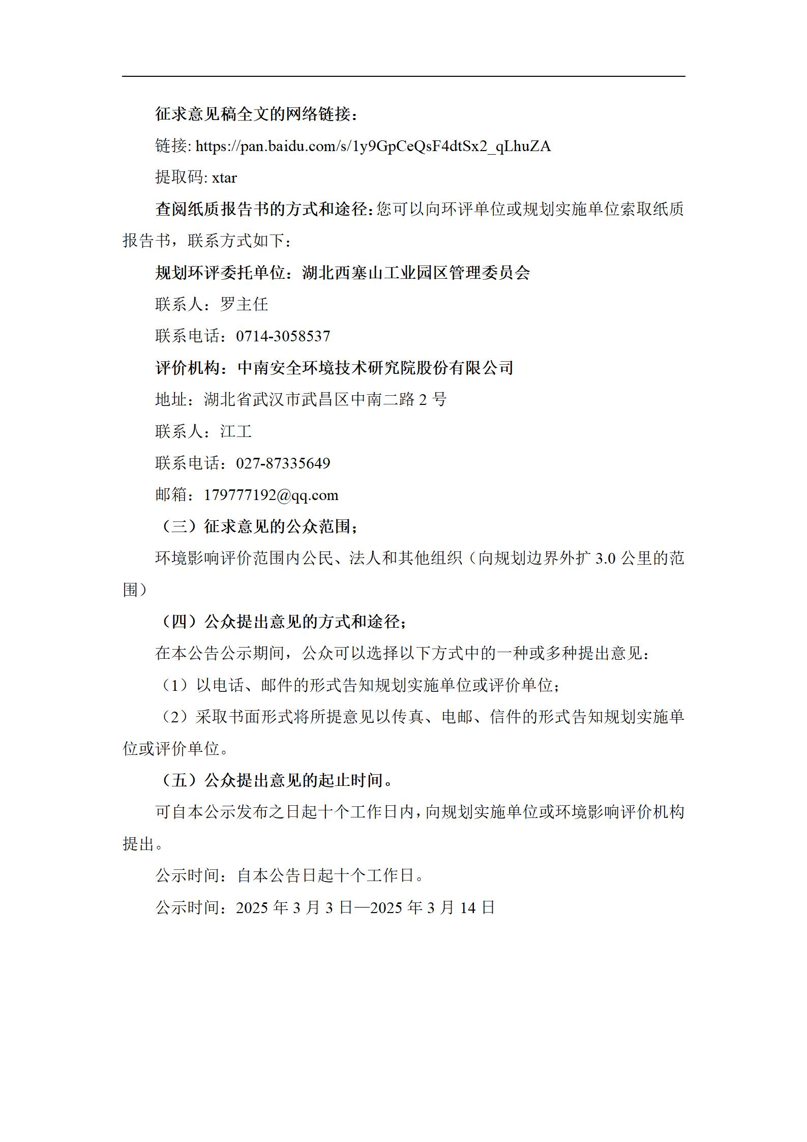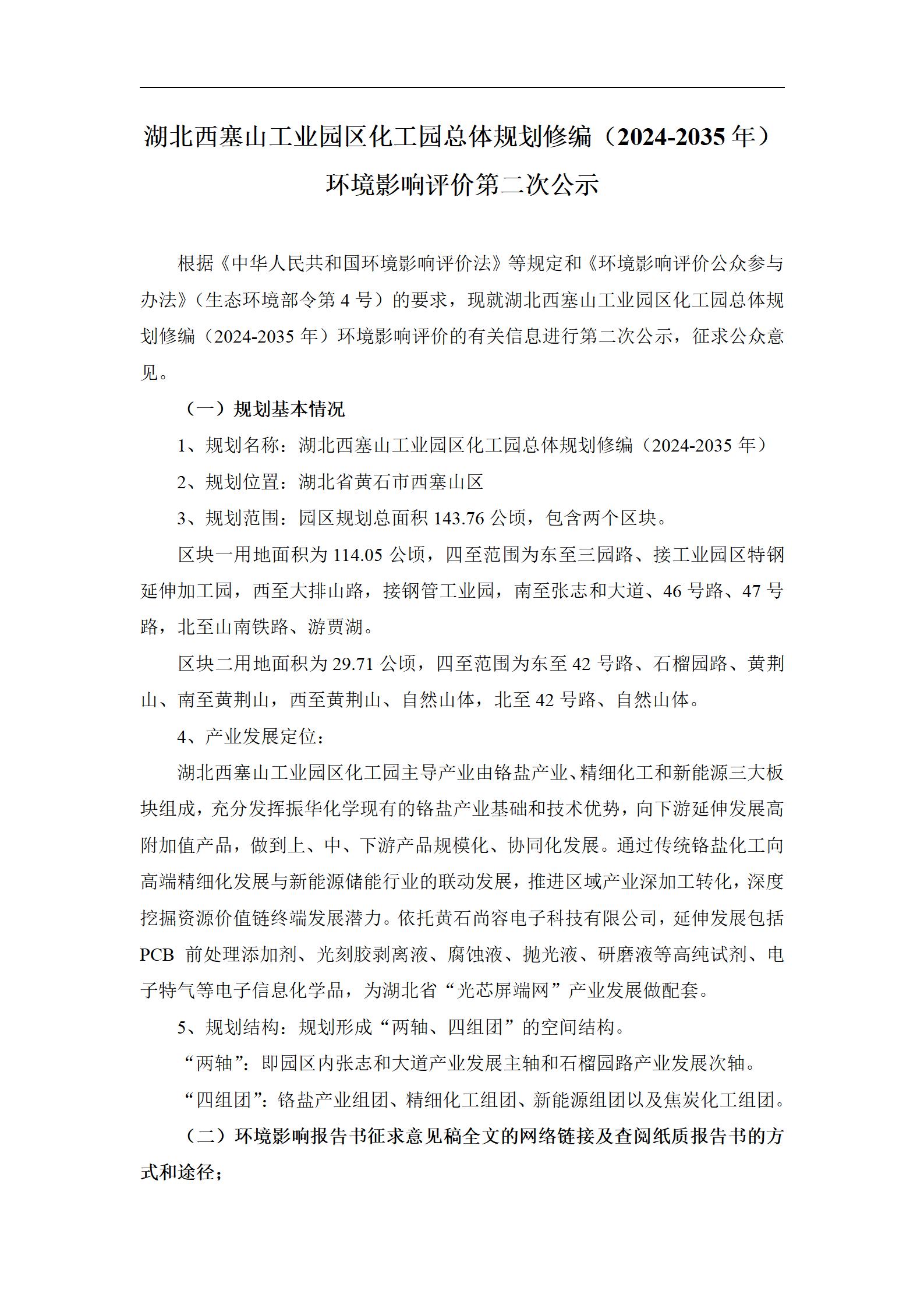 湖北西塞山工業(yè)園區(qū)化工園總體規(guī)劃修編(2024-2035年)環(huán)境影響評價第二次公示