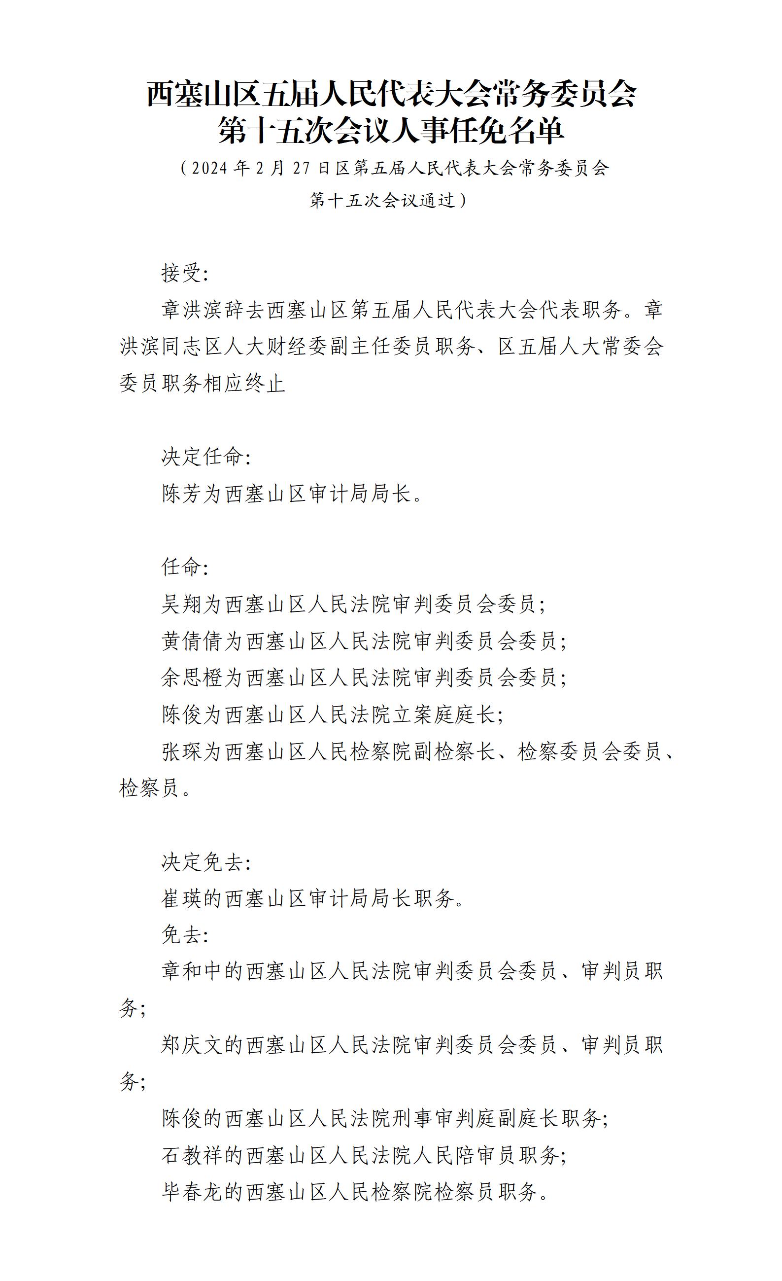 西塞山區(qū)五屆人民代表大會常務委員會第十五次會議人事任免名單