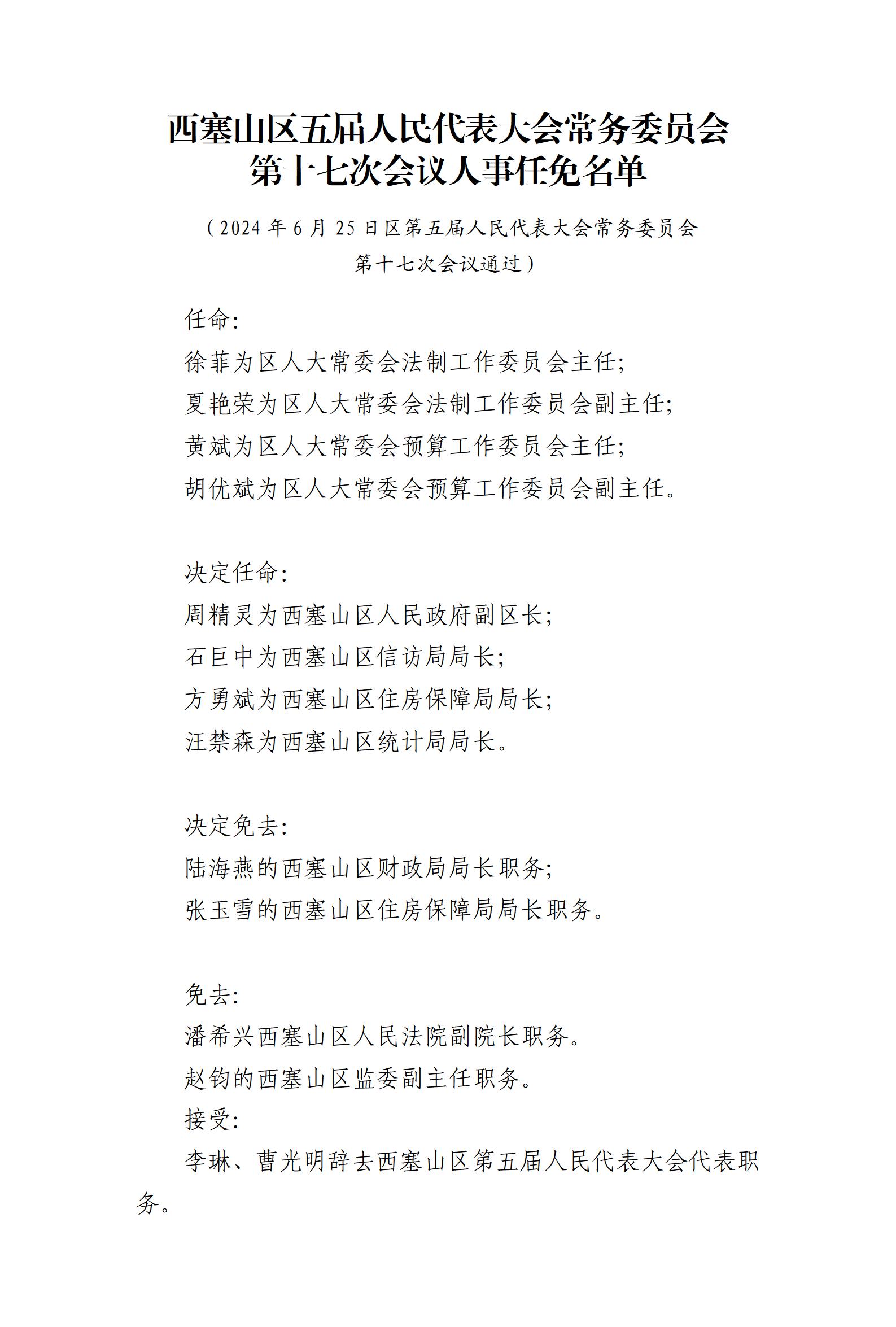 西塞山區(qū)五屆人民代表大會常務(wù)委員會第十七次會議人事任免名單