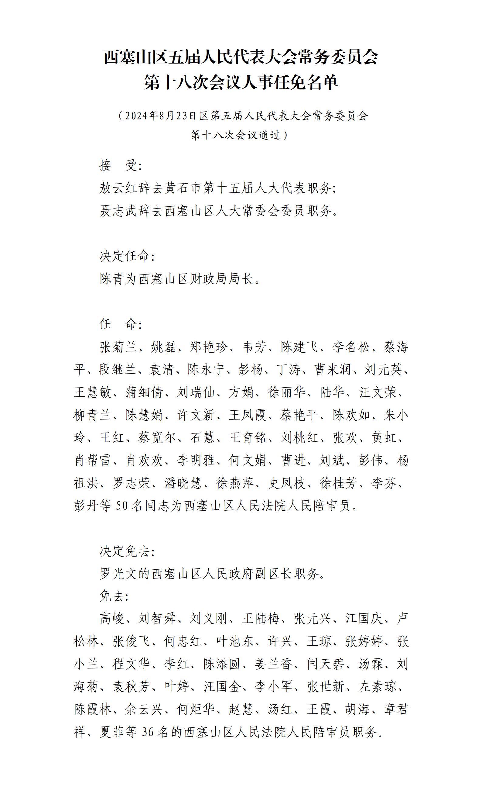 西塞山區(qū)五屆人民代表大會常務委員會第十八次會議人事任免名單